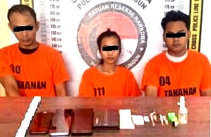 Dua pria dan seorang wanita yang pesta narkoba jenis sabu, diringkus Tim Reskrim Polsek Perdagangan setelah menggerebek Hotel Sundari, Nagori Perlanaan, Kecamatan Bandar, Kabupaten Simalungun.
