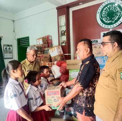 Bantuan dari anak-anak SD yang mengenakan seram putih merah itu diserahkan ke Posko Majelis Ulama Indonesia (MUI) Kota Siantar. Antara lain, mie instan dan bantuan dana, sebagai sikap solidaritas dari uang jajan anak-anak SD yang berwajah polos, Senin (8/12/2025).