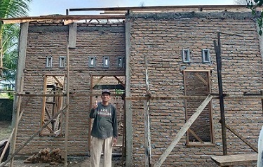 Mariahman Sinaga seperti tidak mampu menyembunyikan rasa bahagia saat  memperlihatkan rumahnya yang sedang dalam proses pembangunan program bedah rumah atas bantuan  Gereja Kristen Protestas Simalungun (GKPS) Distrik 1.