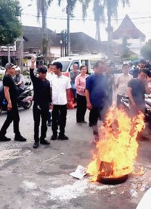 Selanjutnya, massa aksi melakukan pembakaran ban dan tampak “bringas”. Karena itu, Tim Dalmas yang dilengkapi peralatan anti hura hara seperti perisai tetap sigap.