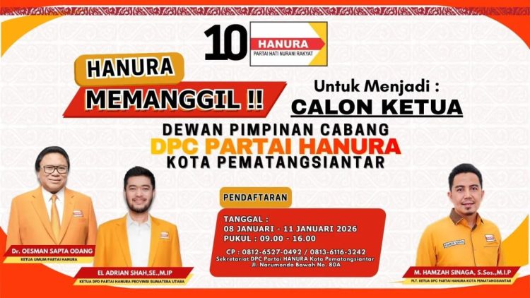 Terkait dengan itu, DPC Partai Hanura Pematangsiantar, memanggil seluruh masyarakat untuk bergabung dan berkesempatan menjadi Ketua DPC Partai Hanura Pematangsiantar.