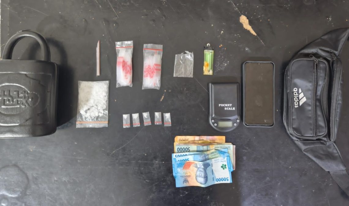 “Dari hasil penggeledahan ditemukan sejumlah barang bukti satu plastik klip besar dan lima plastik klip kecil berisi sabu dengan total berat bruto 13,55 gram, dua bal plastik klip kosong, satu alat sekop dari sedotan plastik.