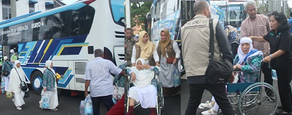 Saat turun dari tiga unit bus yang membawa jemaah dari Asrama Haji Medan, ada beberap orang yang terpaksa dibantu dengan kursi roda untuk kemudian, berkumpul di halaman Kantor Wali Kota. Sementara, barang-barang bawaan jemaah diasingkan ke tempat khusus untuk diambil sanak keluarga masing-masing.