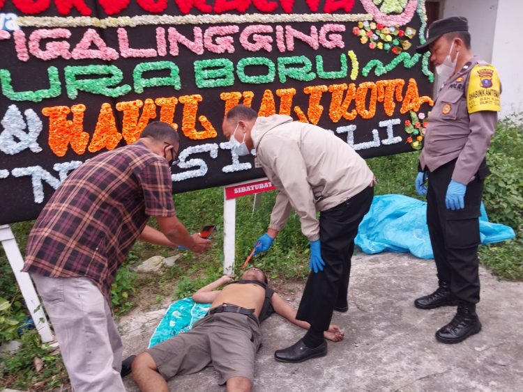 Warga di sekitar salah satu rumah yang sedang menghadapi kemalangan, Jalan Batu Permata, Kelurahan Bah Kapul, Kecamatan Siantar Sitalasari, tiba-tiba heboh melihat sosok tubuh lelaki tergeletak di bawah papan bunga ucapan berduka cita, Selasa (21/3/2023) sekira jam 07.25 WIB.