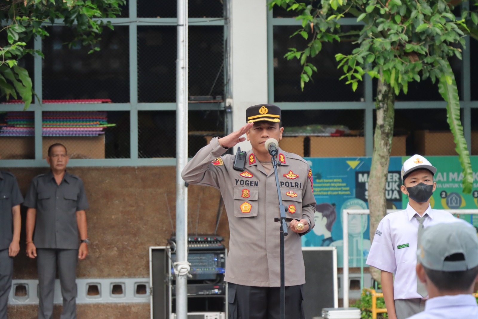 Kapolres Siantar AKBP Yogen Heroes Baruno SH SIK menjadi pembina upacara bendera sebagai program Police Go To School di  SMA Yayasan Perguruan Sultan Agung, Jalan Surabaya, Kelurahan Dwikora, Kecamatan Siantar Barat, Senin (28/8/2023) siang.