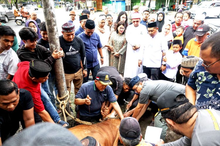 Ketua Majelis Ulama Islam Indonesia (MUI) Pematangsiantar, Drs H M Ali Lubis, sembelih hewan kurban jenis lembu seberat 480 Kg yang diserahkan Ketua TP PKK Kota Siantar Ny Liswati Wesly Silalahi.