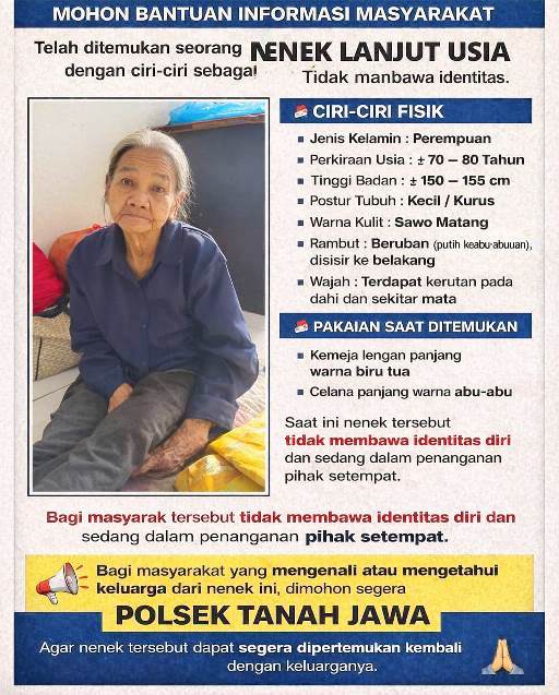 Dijelaskan, peran masyarakat sangat penting. Jika ada yang mengetahui identitas nenek ini atau keluarganya, mohon segera menyampaikan informasi kepada Polsek Tanah Jawa.