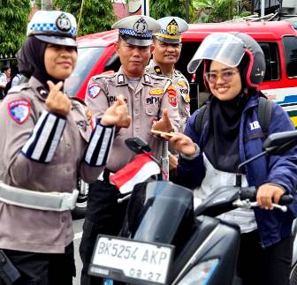 “Pembagian Bendera Merah Putih kepada pengendera roda dua, roda tiga dan empat ini menyambut HUT Kemerdekaan Republik Indonesia ke 80,” ujar Kasat Lantas IPTU Friska Susana SH didampingi Kasat Intelkam IPTU Harry Isdyanto SH MH, Kanit Regidit Sat Lantas IPTU Elon Sitinjak SH.