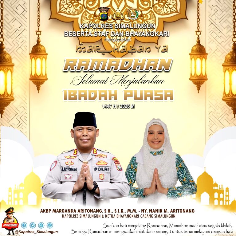 Menyambut bulan suci Ramadan 1447H/2026 M, Kapolres Simalungun, AKBP Marganda Aritonang SH SIK MM, bersama Ketua Bhayangkari Cabang Simalungun, Ny Nanik M. Aritonang beserta seluruh staf dan Bhayangkari, menyampaikan pesan penuh makna kepada masyarakat.