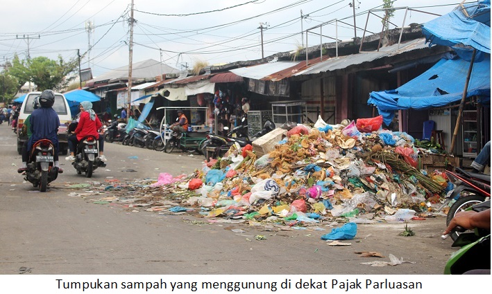 Seperti di Jalan Pantuan Nanggi, samping Pasar Dwikora atau Pajak Parluasan. Sampah yang tingginya sudah hampir satu setengah meter itu malah berserak sampai memakan badan jalan. Sehingga, arus lalulintas saat jam sibuk seperti pagi hari, menjadi terganggu.