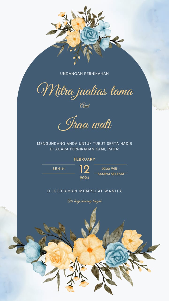 Kami dengan gembira mengundang Anda untuk hadir dan merayakan pernikahan kami. Pernikahan kami akan diselenggarakan pada: