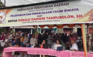Wakil Ketua DPRD Siantar, Ronald Darwin Tampubolon SH melakukan sosialisasi Peraturan Daerah (Perda) No 1 Tahun 2021 tentang Pelestarian dan Pengelolaan Cagar Budaya. Berlangsung di Jalan Dalil Tani II, Kelurahan Kebun Sayur, Kecamatan Siantar Timur, Kota Siantar, Minggu (10/9/2023).
